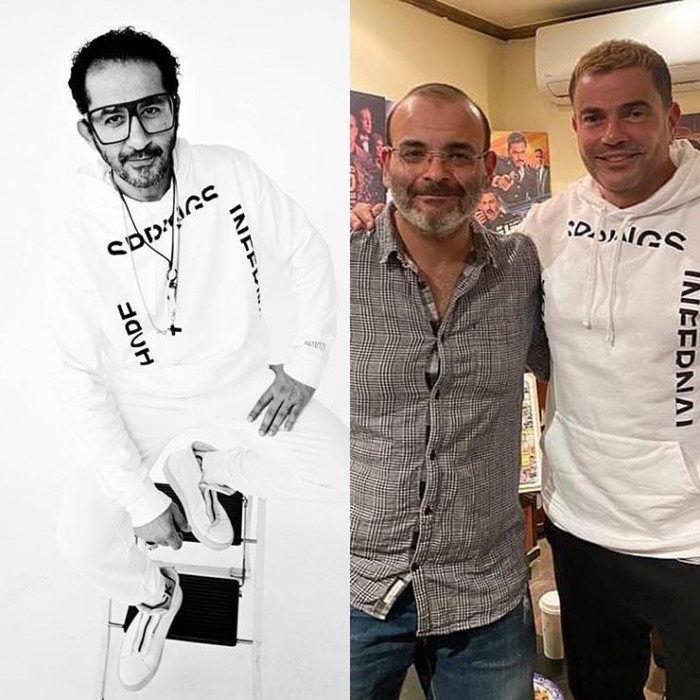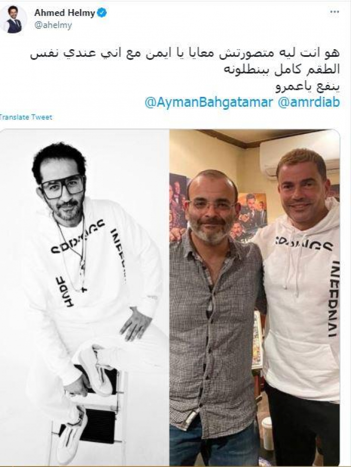 ونشر أحمد حلمي صورة له بـ"التيشيرت"، وأخرى لعمرو دياب مع الكاتب أيمن بهجت قمر، ظهر خلالها الهضبة بنفس "التيشيرت" أيضا.