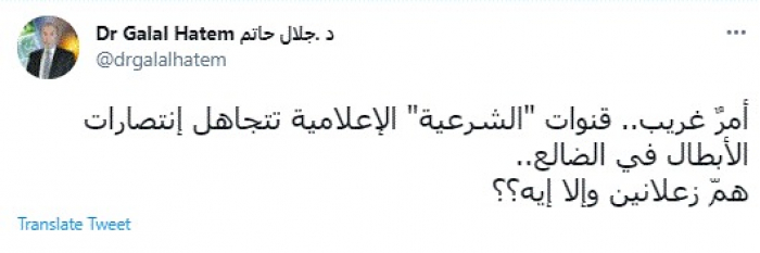 وقال في تغريدة عبر "تويتر" رصدها "المشهد العربي": "أمرٌ غريب.. قنوات "الشرعية" الإعلامية تتجاهل إنتصارات الأبطال في الضالع.. همّ زعلانين وإلا إيه؟".