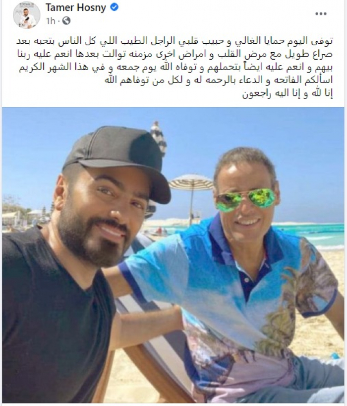 وعلق تامر "توفي اليوم حمايا الغالي وحبيب قلبي الراجل الطيب، اللي كل الناس بتحبه بعد صراع طويل مع مرض القلب، وأمراض أخرى مزمنة توالت بعدها، أنعم عليه ربنا بيهم وأنعم عليه أيضاً بتحملهم وتوفاه الله يوم جمعة وفي هذا الشهر الكريم".
