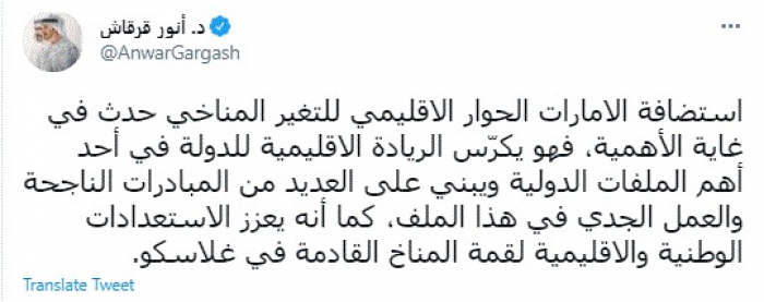 وكتب في تغريدة عبر "تويتر" رصدها "المشهد العربي": "استضافة الامارات الحوار الاقليمي للتغير المناخي حدث في غاية الأهمية، فهو يكرّس الريادة الاقليمية للدولة في أحد أهم الملفات الدولية ويبني على العديد من المبادرات الناجحة والعمل الجدي في هذا الملف، كما أنه يعزز الاستعدادات الوطنية والاقليمية لقمة المناخ القادمة في غلاسكو".