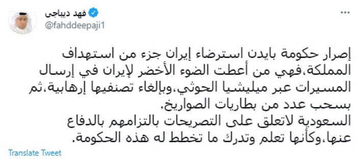 وكتب في تغريدة عبر "تويتر" رصدها "المشهد العربي": "إصرار حكومة بايدن استرضاء إيران جزء من استهداف المملكة،فهي من أعطت الضوء الأخضر لإيران في إرسال المسيرات عبر مليشيا الحوثي، وبإلغاء تصنفيها إرهابية، ثم بسحب عدد من بطاريات الصواريخ".