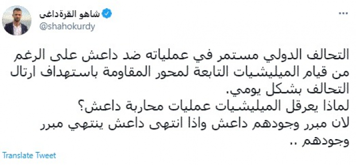 وقال في تغريدة عبر "تويتر" رصدها "المشهد العربي": "التحالف الدولي مستمر في عملياته ضد داعش على الرغم من قيام الميليشيات التابعة لمحور المقاومة باستهداف ارتال التحالف بشكل يومي. لماذا يعرقل الميليشيات عمليات محاربة داعش؟ لأن مبرر وجودهم داعش وإذا انتهى داعش ينتهي مبرر وجودهم".