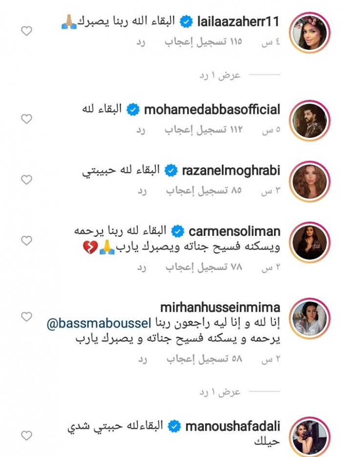 وكذلك كتبت الفنانة ليلى أحمد زاهر: "البقاء لله، ربنا يصبرك"، وكتبت الفنانة رزان مغربي: "البقاء لله حبيبتي".