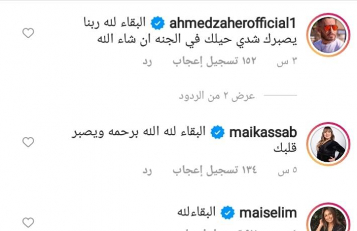 وكتبت الفنانة مي كساب: "البقاء لله.. الله يرحمه ويصبر قلبك"، فيما كتبت الفنانة مي سليم: "البقاء لله".