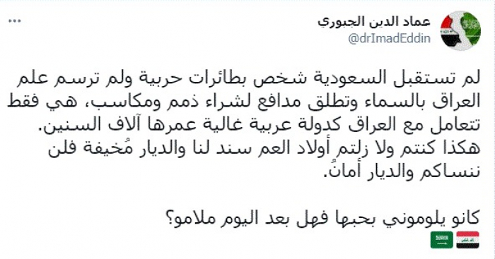 وكتب في تغريدة عبر "تويتر" رصدها "المشهد العربي": "لم تستقبل السعودية شخص بطائرات حربية ولم ترسم علم العراق بالسماء وتطلق مدافع لشراء ذمم ومكاسب، هي فقط تتعامل مع العراق كدولة عربية غالية عمرها آلاف السنين. هكذا كنتم ولا زلتم أولاد العم سند لنا والديار مُخيفة فلن ننساكم والديار أمانُ.. كانوا يلوموني بحبها فهل بعد اليوم ملامو؟".