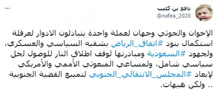 حذر الناشط السياسي نافع بن كليب، من تبادل تنظيم الإخوان الإرهابي ومليشيات الحوثي المدعومة من إيران، للأدوار بهدف تعطيل اتفاق الرياض.