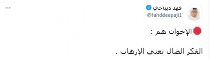 وقال في تغريدة على حسابه بموقع التدوين المصغر تويتر، اليوم إن: "الإخوان هم: الفكر الضال يعني الإرهاب".