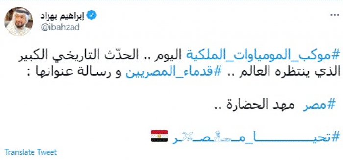 وقال في تغريدة عبر "تويتر" رصدها "المشهد العربي": "موكب المومياوات الملكية اليوم.. الحدّث التاريخي الكبير الذي ينتظره العالم.. قدماء المصريين ورسالة عنوانها: مصر مهد الحضارة".