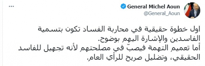 وقال في تغريدة عبر "تويتر" رصدها "المشهد العربي": "أول خطوة حقيقية في محاربة الفساد تكون بتسمية الفاسدين والإشارة اليهم بوضوح. أما تعميم التهمة فيصبّ في مصلحتهم لأنه تجهيل للفاسد الحقيقي، وتضليل صريح للرأي العام".