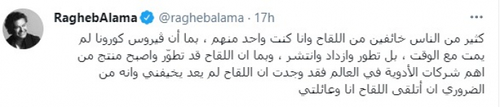 وكتب علامة، عبر حسابه على تويتر: "كتير من الناس خائفين من اللقاح وأنا كنت واحد منهم ، بما أن ڤيروس كورونا لم يمت مع الوقت، بل تطور وازداد وانتشر ، وبما أن اللقاح قد تطوّر وأصبح منتج من أهم شركات الأدوية في العالم، فقد وجدت أن اللقاح لم يعد يخيفني وأنه من الضروري أن أتلقى اللقاح أنا وعائلتي".