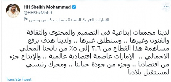 وقال في تغريدة عبر "تويتر" رصدها "المشهد العربي": "لدينا مجمعات إبداعية في التصميم والمحتوى والثقافة والفنون وغيرها .. وسنطلق غيرها ولدينا هدف برفع مساهمة هذا القطاع من ٢.٦ إلى ٥٪ من ناتجنا المحلي الإجمالي .. الإمارات عاصمة اقتصادية عالمية.. والإبداع جزء من اقتصادنا.. وجزء من جودة حياتنا .. ومحرك رئيسي لمستقبل بلادنا".