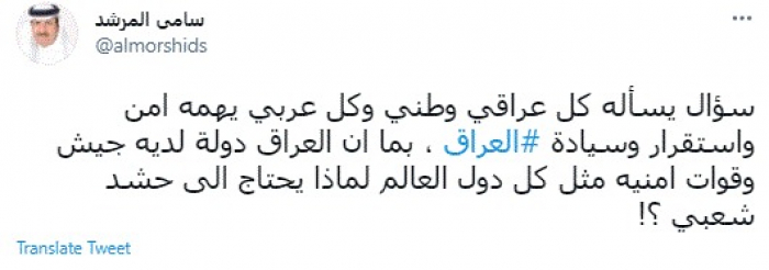 وقال في تغريدة عبر "تويتر" رصدها "المشهد العربي": "سؤال يسأله كل عراقي وطني وكل عربي يهمه أمن واستقرار وسيادة العراق ، بما أن العراق دولة لديه جيش وقوات أمنية مثل كل دول العالم لماذا يحتاج إلى حشد شعبي".