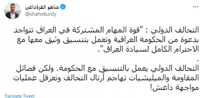 هاجم الكاتب الصحفي العراقي شاهو القرةداغي، اليوم، المليشيات الموالية لإيران في العراق، مؤكدًا أنها تعمل على مهاجمة قوات التحالف الدولي بالعراق وعرقلة عمليات مواجهة تنظيم داعش الإرهابي.