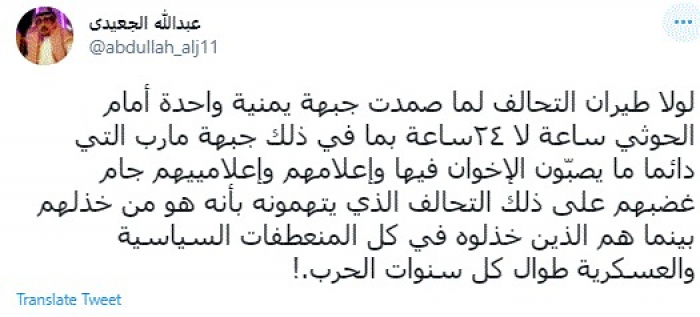 وكتب في تغريدة عبر "تويتر" رصدها "المشهد العربي": "لولا طيران التحالف لما صمدت جبهة يمنية واحدة أمام الحوثي ساعة لا 24 ساعة بما في ذلك جبهة مأرب التي دائما ما يصبّون الإخوان فيها وإعلامهم وإعلامييهم جام غضبهم على ذلك التحالف الذي يتهمونه بأنه هو من خذلهم بينما هم الذين خذلوه في كل المنعطفات السياسية والعسكرية طوال كل سنوات الحرب".