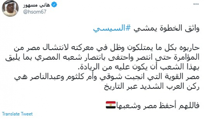 وأضاف: "مصر القوية التي انجبت شوقي وأم كلثوم وعبدالناصر هي ركن العرب الشديد عبر التاريخ.. فاللهم أحفظ مصر وشعبها".