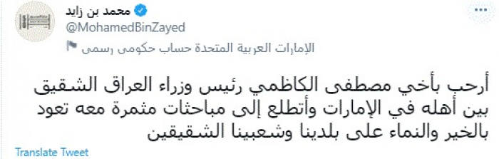 وقال في تغريدة عبر "تويتر" رصدها "المشهد العربي": "أرحب بأخي مصطفى الكاظمي رئيس وزراء العراق الشقيق بين أهله في الإمارات وأتطلع إلى مباحثات مثمرة معه تعود بالخير والنماء على بلدينا وشعبينا الشقيقين".