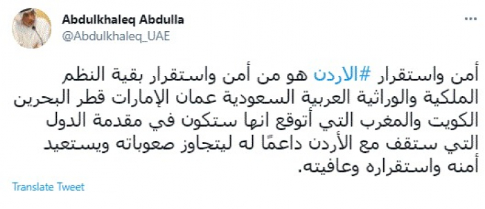 وكتب في تغريدة عبر "تويتر" رصدها "المشهد العربي": "أمن واستقرار الأردن هو من أمن واستقرار بقية النظم الملكية والوراثية العربية السعودية عمان الإمارات قطر البحرين الكويت والمغرب التي أتوقع أنها ستكون في مقدمة الدول التي ستقف مع الأردن داعمًا له ليتجاوز صعوباته ويستعيد أمنه واستقراره وعافيته".