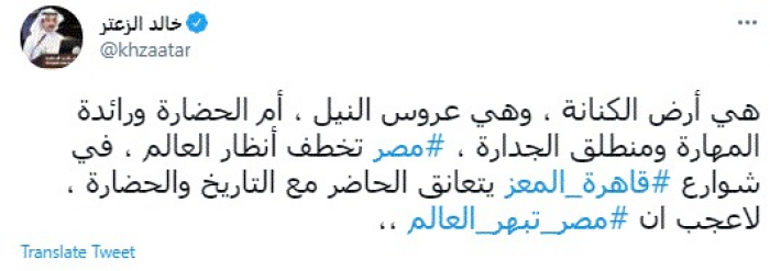 وكتب في تغريدة عبر "تويتر" رصدها "المشهد العربي": "هي أرض الكنانة، وهي عروس النيل، أم الحضارة ورائدة المهارة ومنطلق الجدارة، مصر تخطف أنظار العالم ، في شوارع قاهرة المعز يتعانق الحاضر مع التاريخ والحضارة ، لاعجب أن مصر تبهر العالم".