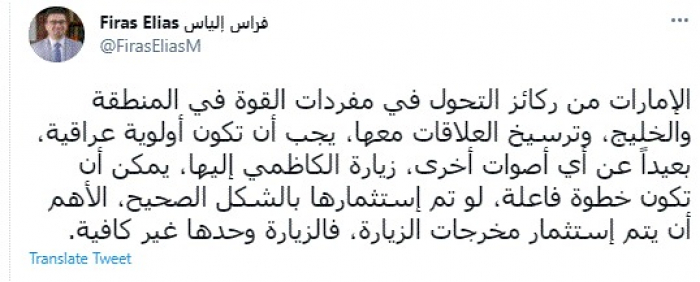 وقال في تغريدة عبر "تويتر" رصدها "المشهد العربي": "الإمارات من ركائز التحول في مفردات القوة في المنطقة والخليج، وترسيخ العلاقات معها، يجب أن تكون أولوية عراقية، بعيداً عن أي أصوات أخرى، زيارة الكاظمي إليها، يمكن أن تكون خطوة فاعلة، لو تم إستثمارها بالشكل الصحيح، الأهم أن يتم إستثمار مخرجات الزيارة، فالزيارة وحدها غير كافية".