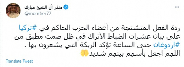 وقال في تغريدة عبر "تويتر" رصدها "المشهد العربي": "ردة الفعل المتشنجة من أعضاء الحزب الحاكم في تركيا على بيان عشرات الضباط الأتراك في ظل صمت مطبق من أردوغان حتى الساعة تؤكد الربكة التي يشعرون بها.. اللهم اجعل بأسهم بينهم شديد".
