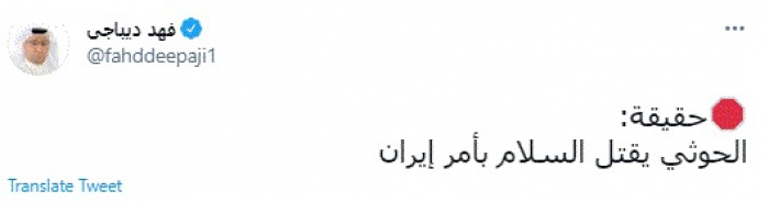 وكتب في تغريدة عبر "تويتر" رصدها "المشهد العربي": "حقيقة: الحوثي يقتل السلام بأمر إيران".