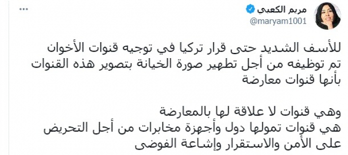 وكتبت في تغريدة عبر "تويتر" رصدها "المشهد العربي": "للأسف الشديد حتى قرار تركيا في توجيه قنوات الأخوان تم توظيفه من أجل تطهير صورة الخيانة بتصوير هذه القنوات بأنها قنوات معارضة وهي قنوات لا علاقة لها بالمعارضة هي قنوات تمولها دول وأجهزة مخابرات من أجل التحريض على الأمن والاستقرار وإشاعة الفوضى".