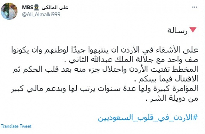 وقال في تغريدة عبر "تويتر" رصدها "المشهد العربي": "على الأشقاء في الأردن أن ينتبهوا جيدًا لوطنهم وأن يكونوا صف واحد مع جلالة الملك عبدالله الثاني.. المخطط تفتيت الأردن واحتلال جزء منه بعد قلب الحكم ثم الاقتتال فيما بينكم.. المؤامرة كبيرة ولها عدة سنوات يرتب لها وبدعم مالي كبير من دويلة الشر".