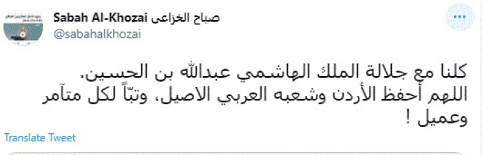وقال في تغريدة عبر "تويتر" رصدها "المشهد العربي": "كلنا مع جلالة الملك الهاشمي عبدالله بن الحسين. اللهم أحفظ الأردن وشعبه العربي الاصيل، وتبّاً لكل متآمر وعميل".