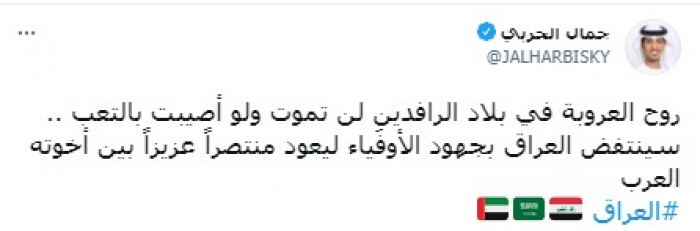 قال الإعلامي الإماراتي جمال الحربي، إن العراق ينتفض بجهود أبنائه للعودة بين أخوانه العرب.