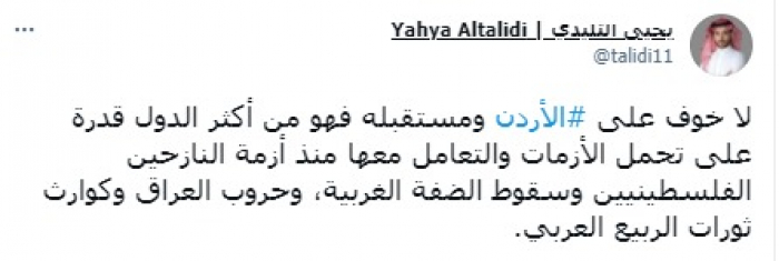 ورأى في تغريدة على حسابه بموقع التدوين المصغر تويتر، اليوم إنه: "لا خوف على الأردن ومستقبله فهو من أكثر الدول قدرة على تحمل الأزمات والتعامل معها".