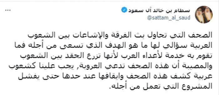 استنكر الأمير السعودي سطام بن خالد آل سعود، نشر صحف شائعات لبث الفتنة بين الشعوب العربية، مؤكدا أنها تخدم أعداء العرب.
