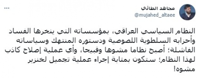 وشدد في تغريدة على حسابه بموقع التدوين المصغر تويتر، اليوم على أن: "النظام السياسي العراقي، بمؤسساته التي ينخرها الفساد وأحزابه السلطوية اللصوصية ودستوره المنتهك وسياساته الفاشلة؛ أصبح نظاما مشوها وقبيحا".
