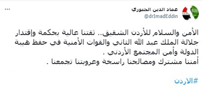 وتطلع في تغريدة على حسابه بموقع التدوين المصغر تويتر، اليوم إلى: "الأمن والسلام للأردن الشقيق"، مضيفا أن: "ثقتنا عالية بحكمة واقتدار جلالة الملك عبد الله الثاني والقوات الأمنية في حفظ هيبة الدولة وأمن المجتمع الأردني".