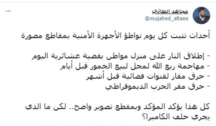 وأوضح أن منها: "إطلاق النار على منزل مواطن بقضية عشائرية اليوم، مهاجمة ربع الله لمحل لبيع الخمور قبل أيام، حرق مقار لقنوات فضائية قبل أشهر، حرق مقر الحزب الديموقراطي".