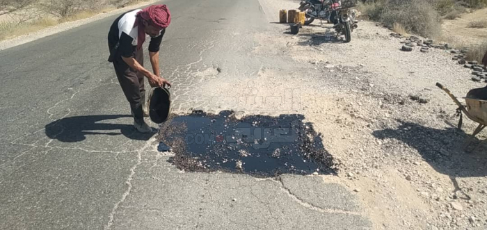 وواصل شباب المنطقة استكمال ردم الحفر المنتشرة على طول الطريق، نظرًا لاتساعها وخطورتها، باستخدام زيوت السيارات والأتربة.