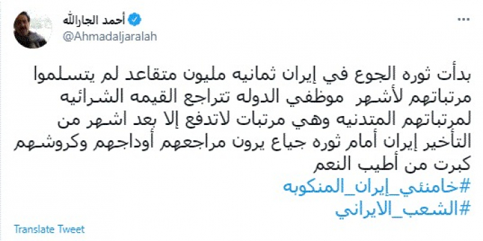 وكتب في تغريدة عبر "تويتر" رصدها "المشهد العربي": "بدأت ثورة الجوع في إيران ثمانية مليون متقاعد لم يتسلموا مرتباتهم لأشهر موظفي الدولة تتراجع القيمة الشرائية لمرتباتهم المتدنية وهي مرتبات لا تدفع إلا بعد أشهر من التأخير إيران أمام ثوره جياع يرون مراجعهم ..... وكروشهم كبرت من أطيب النعم".