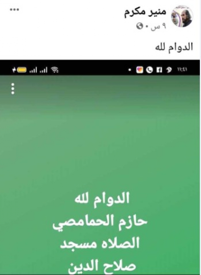وكتب منير: "الدوام لله حازم الحمامصي، الصلاة في مسجد صلاح الدين أمام المسرح العائم ومدافن الأسرة باب الوزير".