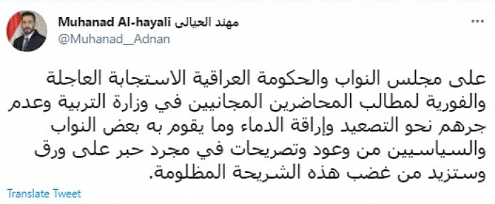 وقال في تغريدة عبر "تويتر" رصدها "المشهد العربي": "على مجلس النواب والحكومة العراقية الاستجابة العاجلة والفورية لمطالب المحاضرين المجانيين في وزارة التربية وعدم جرهم نحو التصعيد وإراقة الدماء وما يقوم به بعض النواب والسياسيين من وعود وتصريحات في مجرد حبر على ورق وستزيد من غضب هذه الشريحة المظلومة".