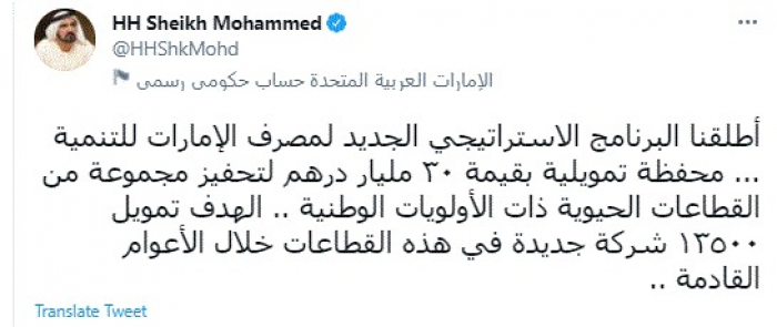 وقال في تغريدة عبر "تويتر" رصدها "المشهد العربي": " أطلقنا البرنامج الاستراتيجي الجديد لمصرف الإمارات للتنمية... محفظة تمويلية بقيمة ٣٠ مليار درهم لتحفيز مجموعة من القطاعات الحيوية ذات الأولويات الوطنية .. الهدف تمويل ١٣٥٠٠ شركة جديدة في هذه القطاعات خلال الأعوام القادمة".
