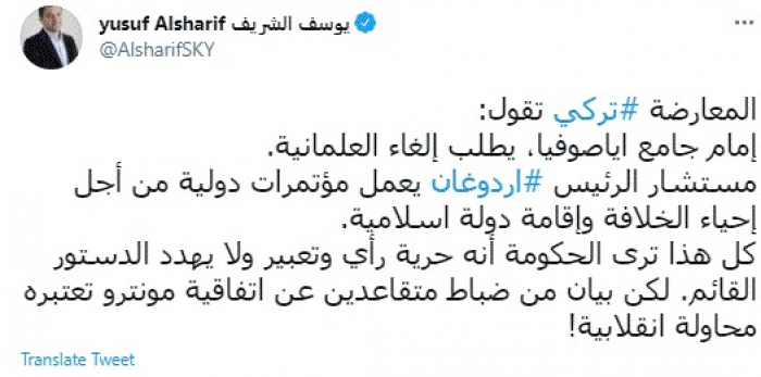 وقال في تغريدة عبر "تويتر" رصدها "المشهد العربي": "المعارضة تركي تقول: إمام جامع اياصوفيا، يطلب إلغاء العلمانية. مستشار الرئيس أردوغان يعمل مؤتمرات دولية من أجل إحياء الخلافة وإقامة دولة إسلامية".