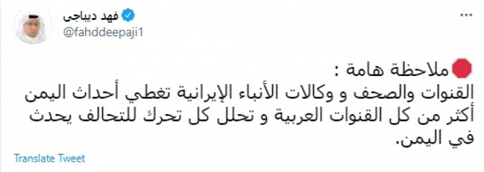 وكتب في تغريدة عبر "تويتر" رصدها "المشهد العربي": "القنوات والصحف ووكالات الأنباء الإيرانية تغطي أحداث اليمن أكثر من كل القنوات العربية وتحلل كل تحرك للتحالف يحدث في اليمن".
