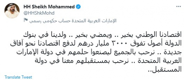 وقال في تغريدة عبر "تويتر" رصدها "المشهد العربي": " اقتصادنا الوطني بخير .. ويمضي بخير .. ولدينا في بنوك الدولة أصول تفوق ٣٠٠٠ مليار درهم لدفع اقتصادنا نحو آفاق جديدة".