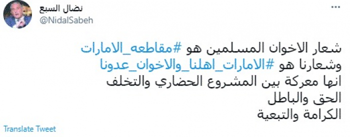 وقال في تغريدة عبر "تويتر" رصدها "المشهد العربي": "شعار الإخوان المسلمين هو مقاطعة الإمارات وشعارنا هو الإمارات أهلنا والإخوان عدونا إنها معركة بين المشروع الحضاري والتخلف الحق والباطل الكرامة والتبعية".
