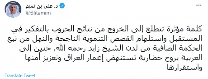 وقال في تغريدة عبر "تويتر" رصدها "المشهد العربي": "كلمة مؤثرة تتطلع إلى الخروج من نتائج الحروب بالتفكير في المستقبل واستلهام القصص التنموية الناجحة والنهل من نبع الحكمة الصافية من لدن الشيخ زايد رحمه الله. حنين إلى العربية بروح حضارية تستنهض إعمار العراق وتعزيز أمنها واستقرارها".