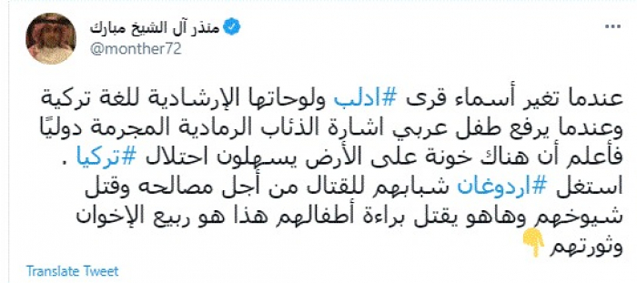 وقال في تغريدة عبر "تويتر" رصدها "المشهد العربي": "عندما تغير أسماء قرى إدلب ولوحاتها الإرشادية للغة تركية وعندما يرفع طفل عربي اشارة الذئاب الرمادية المجرمة دوليًا فأعلم أن هناك خونة على الأرض يسهلون احتلال تركيا".