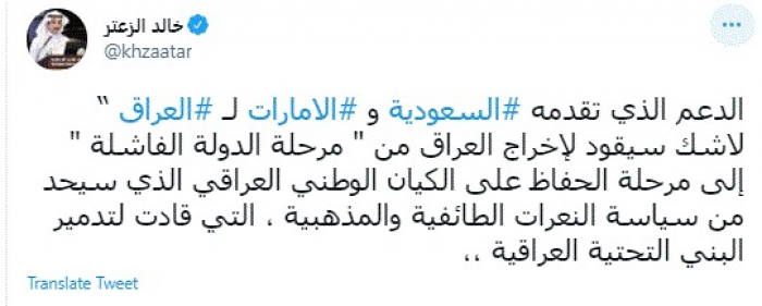 وكتب في تغريدة عبر "تويتر" رصدها "المشهد العربي": "الدعم الذي تقدمه السعودية والإمارات للعراق لا شك سيقود لإخراج العراق من مرحلة الدولة الفاشلة إلى مرحلة الحفاظ على الكيان الوطني العراقي الذي سيحد من سياسة النعرات الطائفية والمذهبية، التي قادت لتدمير البني التحتية العراقية".