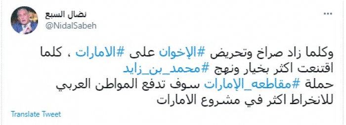 وقال في تغريدة عبر "تويتر" رصدها "المشهد العربي": "وكلما زاد صراخ وتحريض الإخوان على الإمارات، كلما اقتنعت أكثر بخيار ونهج محمد بن زايد.. حملة مقاطعه الإمارات سوف تدفع المواطن العربي للانخراط أكثر في مشروع الإمارات".