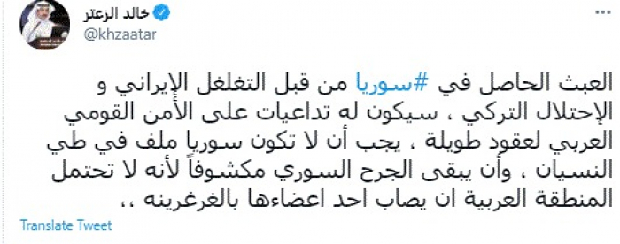 الزعتر يُحذر من خطورة استمرار العبث الإيراني التركي في سوريا
