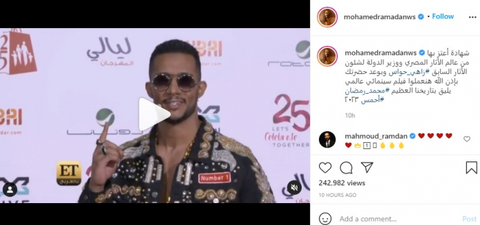 من جانبه، أضاف رمضان جزءا من أغنيته "أنا الملك"، معلقًا "شهادة أعتز بها من عالم الآثار المصري ووزير الدولة لشئون الآثار السابق زاهي حواس".