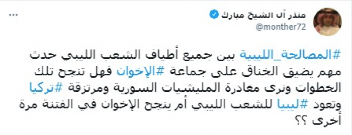 رأى المدون السعودي منذر آل الشيخ أن المصالحة الليبية تضمن تضييق الخناق على تنظيم الإخوان الإرهابي، وتدفع إلى رحيل المرتزقة عن ليبيا.